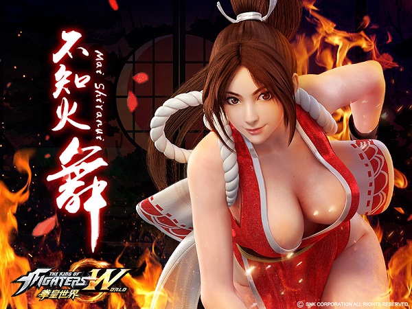 「不知火舞」是拳皇系列中最受歡迎女角色之一,其性感撩人的造型讓不少玩家奉為拳皇第一女神。不知火舞為古老不知火流的繼承人,從小在不知火半藏的道場中,與弟子們修練流派的拳法長大。直到某天不知火半藏收了一位外國人「安迪」當徒弟,因其帥氣的外貌讓不知火舞陷入愛情,並不斷以熱情的攻勢積極逼婚,讓安迪招架不住,便開始兩人的不解之緣。在《拳皇世界》中不知火舞同樣以格鬥家身份登場,且透過360°旋轉畫面呈現下,角色外貌一覽無疑,讓遊戲中的不知火舞更顯美豔,但在亮麗的外表下實力卻是不容小覷的,以扇子做為武器,施展不知火流派忍術,攻守兼備的「水鳥之舞」能夠快速向後翻滾遠離危險區域並擲出大量火焰扇子擊退敵人,且經典招式「超必殺忍蜂」將火焰纏繞自身,並對前方敵人發動衝擊造成強大傷害,讓人見識到性感女忍者的強悍之處。