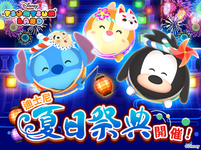 充滿夏天的氛圍,綺麗的花火,迪士尼夏日祭典即將來臨,特殊夏祭攤販關卡等你挑戰!玩家需派出3隻Tsum齊力完成關卡,活動特別推薦夏祭活動主題角色「夏祭史迪奇」、「夏祭麥克斯」及「夏祭克莉絲」,困難模式全關卡通關後,還可獲得豪華夏祭獎勵及S Tsum泡泡喔!