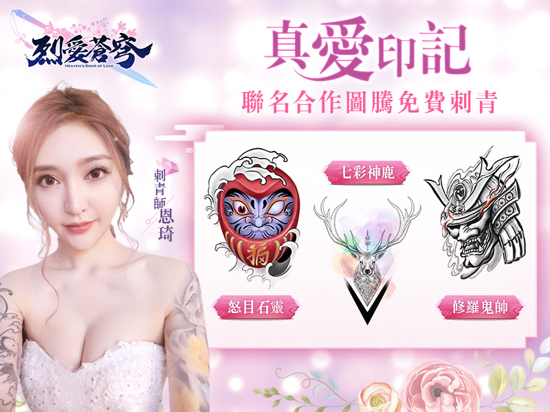《烈愛蒼穹》與「恩琦美學」重磅跨界聯名「真愛印記」合作活動從即日起至6月16日,由全台最正刺青師「恩琦」親自設計,將三界六道的萬千神靈轉化為充滿藝術感的「怒目石靈」、「七彩神鹿」、「修羅鬼帥」三款聯名圖騰。玩家們將有機會把充滿神秘魅力的神靈以紋身的形式化作身體的一部分,不只是獨一無二的綴點,更是對自我個性的完美詮釋。