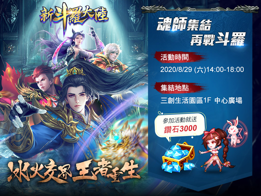 前世唐門恩怨再掀波瀾,全新SS魂師「前世唐三」颯爽登場,強大的群體攻擊技能以及精美的造型絕對值得擁有,官方也宣布有更多精彩活動等待玩家的參與。即將展開的「魂師集結,再戰斗羅」快閃活動,召集所有《新斗羅大陸》玩家於8月29日在「三創生活園區中心廣場」同歡,玩家當天只要到場就可以拿到「超值見面禮包2000鑽石禮包」,填寫活動問券再送「1000鑽石」,只要參加活動保證可拿「3000鑽石」!還有豐富有趣、關關有獎的「虛寶大轉盤」、「真人大富翁」等闖關活動,「SS魂師碎片」、「S魂師碎片」、「S魂骨」等超級豐盛的禮包和美食保證拿到手軟!