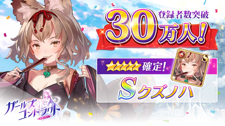 感謝玩家支持,登錄人數突破最終門檻30萬大關,預約特典確定將全數放送給玩家,包含【昇級石】、【魂晶】、【金幣】、【星石】以及【召喚券】,還能獲得超強S級角色クズノハ(CV:悠木碧),讓玩家一開局就擁有強大的戰力。