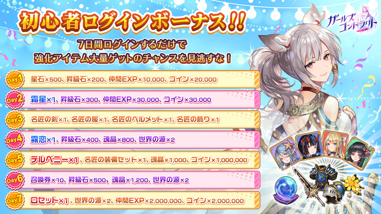 伴隨遊戲正式上線,遊戲內同時舉辦新手登入就送好禮的獎勵活動。只要登入滿七天,就可獲得強力夥伴、夥伴經驗值、裝備等等實用道具。再搭配事前登錄人數達標獎勵,讓玩家一開始就可以在資源充足的狀態下,輕鬆遊玩無壓力。