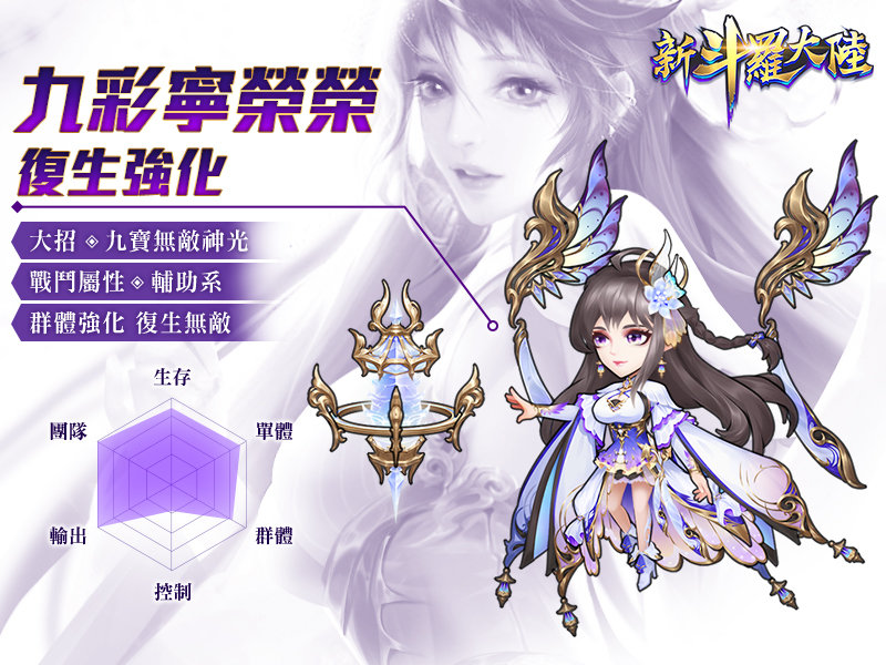 作為全斗羅大陸輔助第一宗派──七寶琉璃宗後人的寧榮榮,其天賦與實力被譽為魂師界千年不遇的奇才。在歷經不同考驗與試煉後,這次寧榮榮身上帶著全新的蛻變而來!七寶琉璃塔進化為傳說中的「九寶琉璃塔」,應證了斗羅大陸最強輔助魂師的稱號!