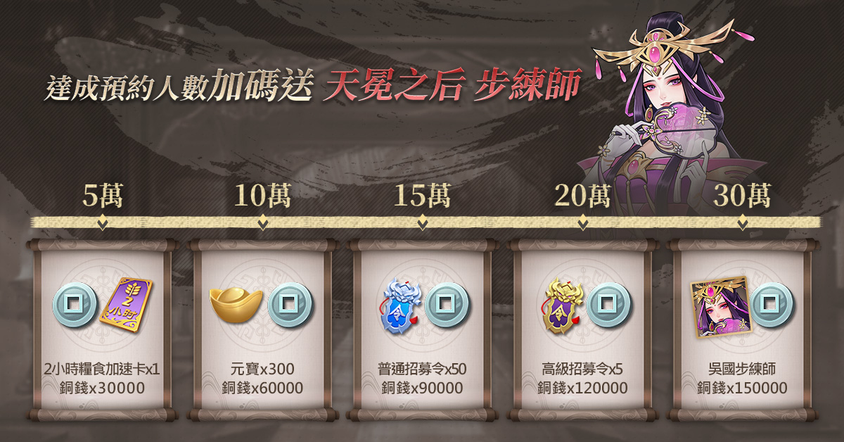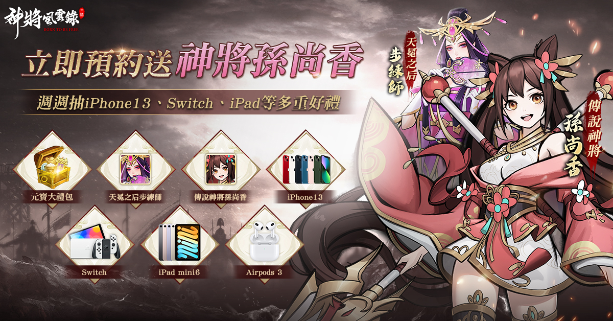 《神將風雲錄》於1日正式開啟事前預約活動,主公只要在活動網頁完成預約,即可獲得體驗遊戲時大有助益的神將及道具;累積集氣人氣達 5 萬到 30 萬的參與人數更有各階段的虛寶豪禮大放送,「步練師」、「孫尚香」等預約專屬神將皆可盡納麾下。活動期間還週週抽 iPhone 13、iPad Mini6、Airpods 3、Mycard點數卡等豐富大獎,快手刀前往事前登錄頁面吧!也別忘了前往「Google Play」、「App Store」完成雙商店的預約活動,可領取商店預約禮包喔!