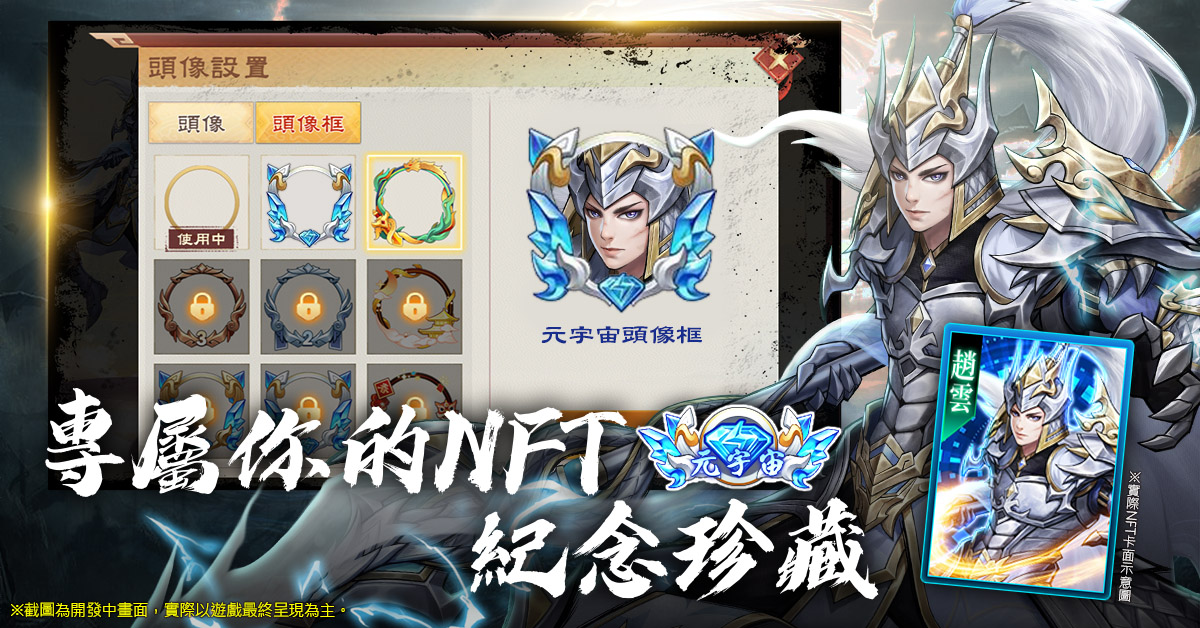 於MetaData資訊中,也將提供客製化資訊,記錄主公獨有的三國經歷,規劃中包含:角色名、等級、戰力、戰力排名、角色創建時間、自選三國經典語錄等資訊,使玩家得到的的NFT成為獨一無二的紀念珍藏。此外,擁有NFT的主公除了能在手遊中獲得限量且永久的【頭像框、稱號】,以及【1,000元寶】外,固定每日、每15日還可領取豐富獎勵,每儲值一筆元寶,贈送額外3%元寶數。只要完成事前預約,便有機會獲得《神將風雲錄》手遊與NFT的第一次跨界贈禮,快預約神將風雲錄,獲得你的專屬NFT。