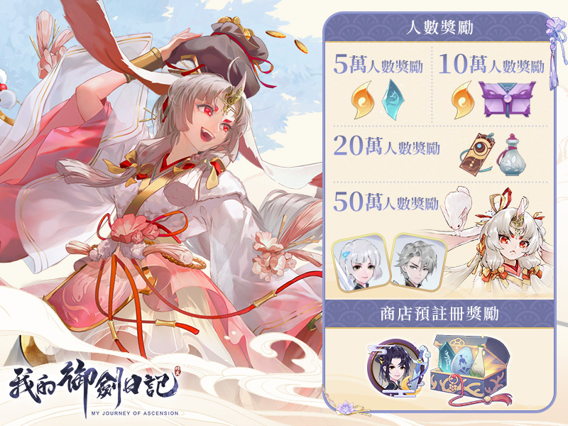 《我的御劍日記》事前登錄活動現即日起展開,只要完整參與活動,皆可獲得官方準備的高額虛寶獎勵: 「仙晶、喚靈籤、妖物晶魄、道骨丹、武器法寶..等」,以及預註冊專屬頭像框「御劍八荒」、專屬髮型「玉臘梅枝」。最厲害的還有,仙品妖靈「玄兔」!