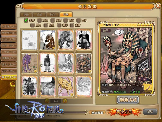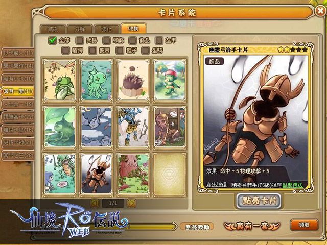 為了滿足卡片收集愛好者的需求,營運團隊隆重推出卡片收集系統。卡片等級從1星到5星,每收集到一個卡片,此卡片就會被點亮,該頁的卡片全部被點亮後,即可點擊「領取」獲得遊戲獎勵。不僅可以簡單獲得獎勵,也可以了解各卡牌的效果,讓玩家們可按卡牌屬性能力輕鬆對付各種怪物及BOSS。